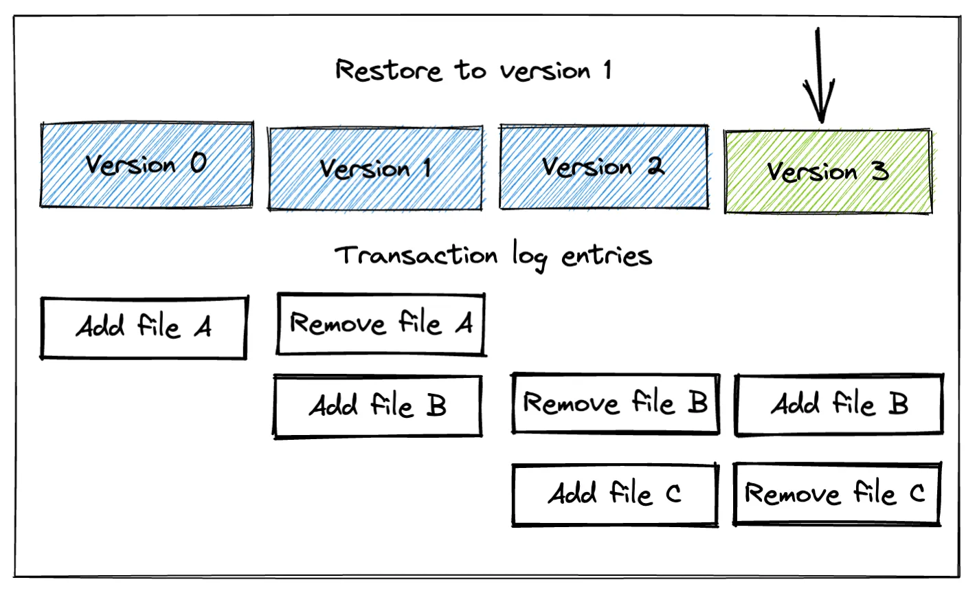 Using the restore command resets the table’s content to an earlier version, but doesn’t remove any data. It simply updates the transaction log to indicate that certain files should not be read. The following diagram provides a visual representation of the transaction log entries for each transaction.