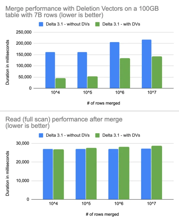The Delta Lake 3.0 release included some major performance upgrades for UPDATE and DELETE statements, through their support of Deletion Vectors. With this release, MERGE now also supports Deletion Vectors. This reduces the write overhead for MERGE operations and improves their performance by up to 3.7x. The graph below shows how small updates on a very large table are faster with Deletion Vectors with almost no impact on read performance after merge.