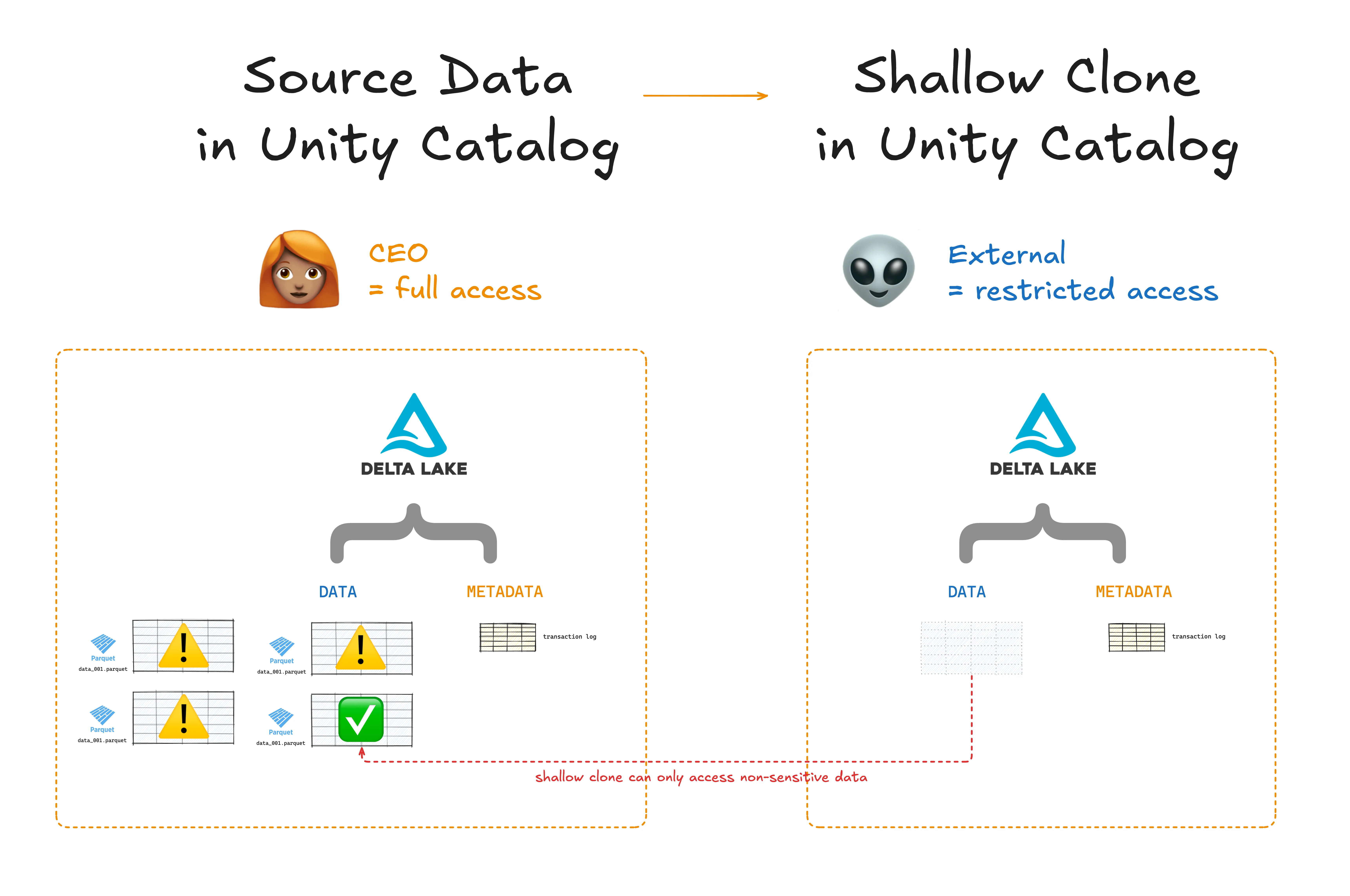 For example, you can use shallow clone with Unity Catalog to restrict access to sensitive tables when sharing data with external parties.