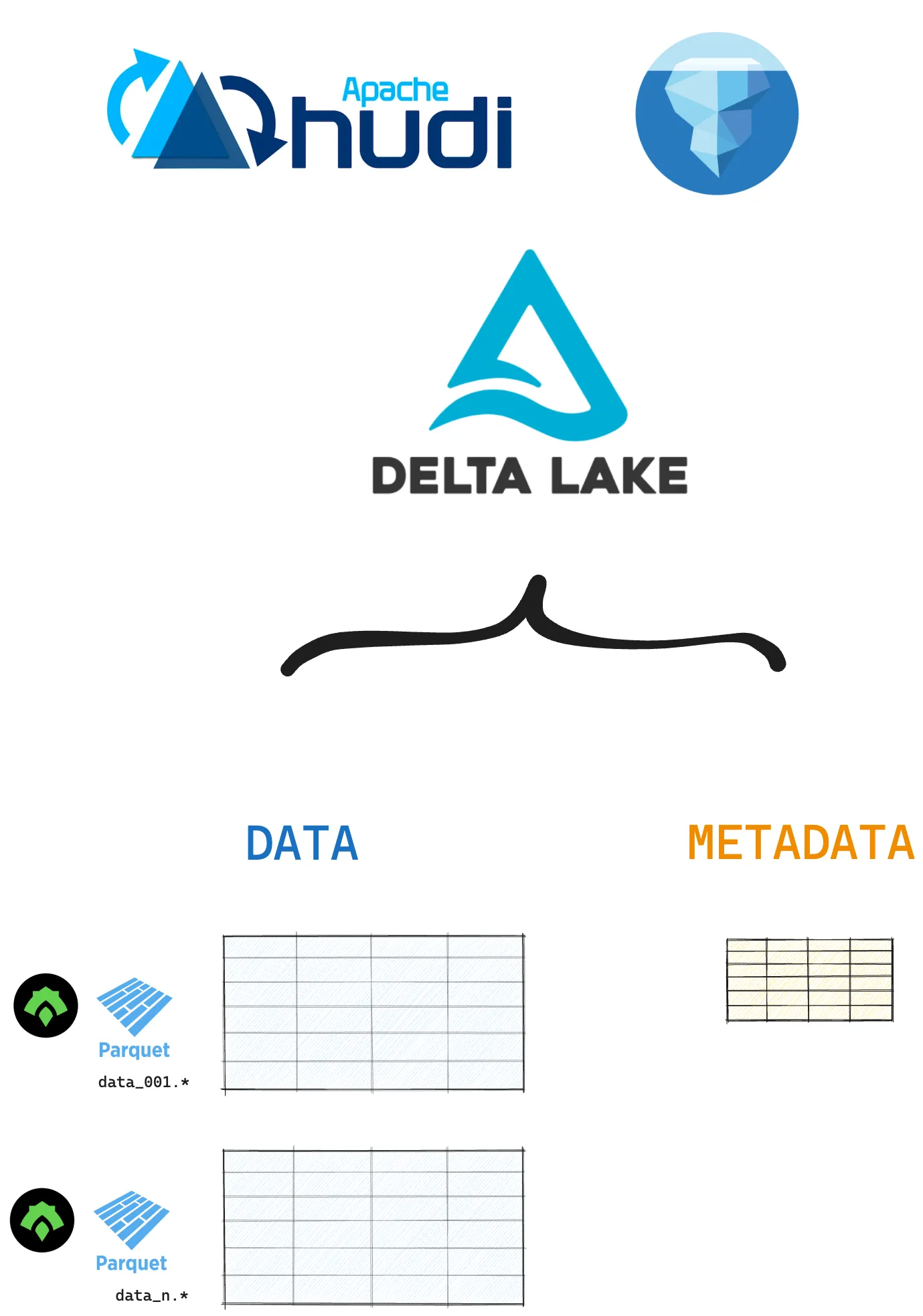 Open table formats are an open-source technology for storing tabular data that builds on top of existing file formats like Parquet and ORC. An open table format stores your tabular data in files and stores metadata (about your data and operations) in a separate file or directory. This metadata is used to enable many of the great features of open table formats: faster query speeds, more reliable transactions and lower risk of data corruption.